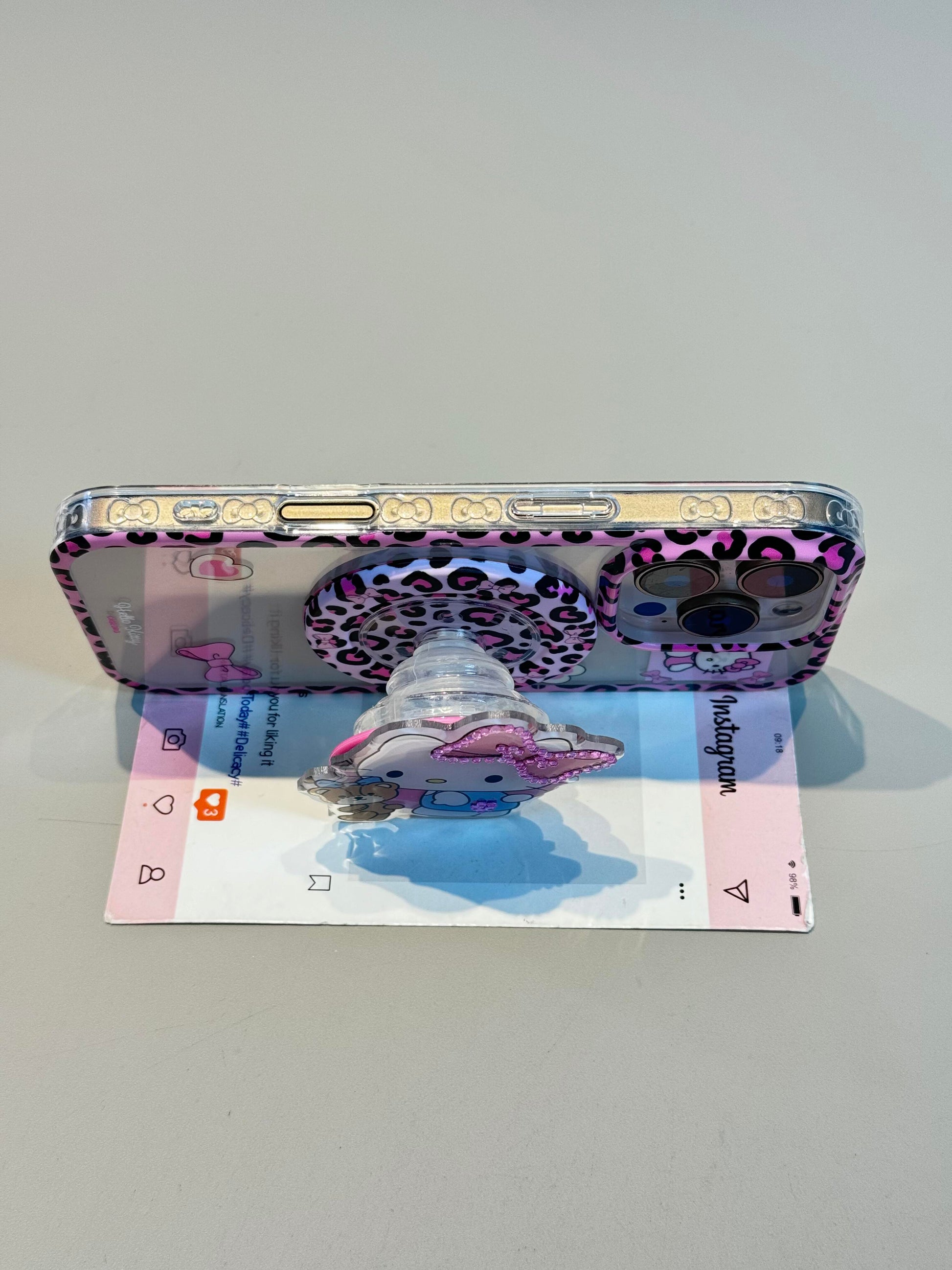 Hellokitty Pink Leopard Print Clear Cute Kawaii MagSafe Case + MagSafe Stand Holder / Phone Grip #0540