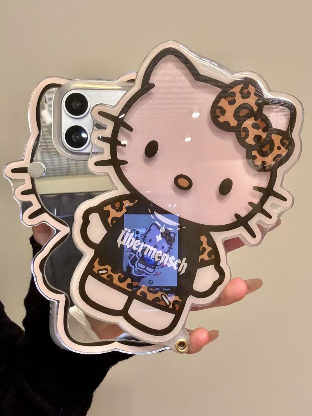 Hellokitty Shaped Leopard Print Folding Mirror Cute Kawaii Phone Case with Phone Chain#0577